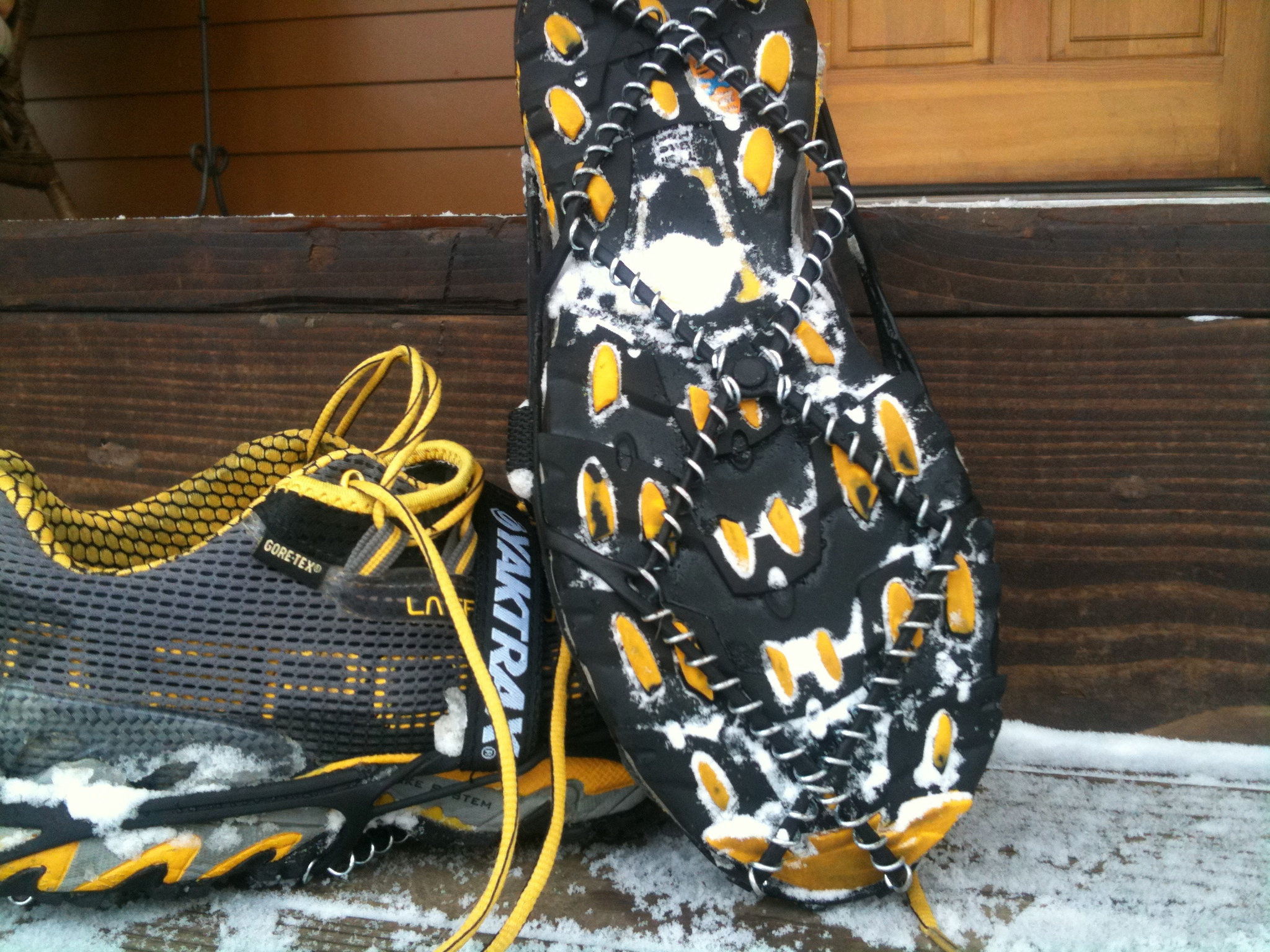 The year of running began in similar cold and snowy conditions, but I’ve gained experience on proper cold weather attire. I dressed in a Reebok Compression long sleeve jersey that my mother-in-law gave me for Christmas. Compression gear is awesome. Over that I wore a loose fitting fleece pull-over and then some Under Armour Cold Gear. So three long sleeve tops and then some running shorts covered with a pair of Under Armour Cold Gear running pants. I also wore some running gloves, fleece running hat and sported 3 days of fashionable facial stubble in recognition of a recent 1000 mile drive from Austin to Longmont. But the star of my running ensemble were the YakTrax I received as a Christmas gift from my brother-in-law. Click on the picture for a close-up. These rubber and metal treads simply slip over your shoes for added traction in snow and ice. I ran over a combination of packed snow, fresh powder, sidewalks and pavement. My trail running shoes provide sufficient stability over snow, but these metal coils gripped the unctuous patches of ice with confidence. I can’t wait to try them on the muddy trails this coming spring.