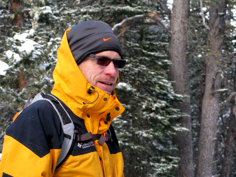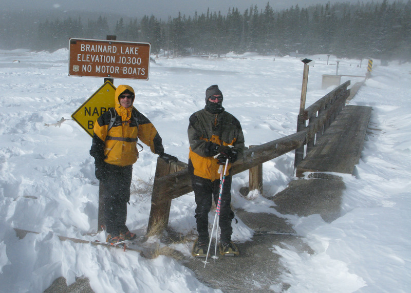 A friendly couple dressed in matching blue ski jackets took this picture of the three of us. That’s Jeff Graham – stage right, and his brother Rob – to Jeff’s left. I can’t recall if I’m sitting down because I was tired or if I slipped and fell. Perhaps both. This was still early in our trek. We reached a frozen pond that was pretty cool, but also quite breezy so we continued onward. The trail was extremely easy to follow until we neared Brainard Lake. We seemed to lose the trail markers, but apparently all tracks eventually lead to the lake. The wind returned with arctic-like ferociousness along the lake shore. We debated whether to hike around the lake but the chinook tempest made our minds for us and we kept to the tree line for protection. We found a picnic spot and ate lunch.