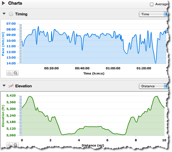 I always felt like the initial hill starting from the trail head up to the water tower was about a half mile. Well it is – exactly. I didn’t know that the flat top of the hill is a quarter mile – good to know. It’s a nice recovery before heading down the far side. I also know now that it’s a full mile to the bottom of the hill. This side of the hill is such a bear on the return – and now I know it’s a quarter mile bear. I also know the elevation of both sides – the Garmin doesn’t stop with just distance. The run begins at 5308 feet, peaks at 5420 – the highest point for the entire trail – and drops down to 5289 at the 1 mile point. This explains why running it on the return is so hard even though it’s half the distance, it’s both a larger elevation climb and steeper. The elevation chart above appears symmetrical because it’s an out and back course.