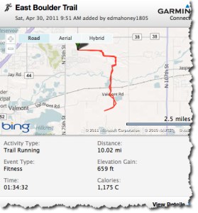 The coolest thing for me is that I tend to run trails or courses where I don’t have a good sense of the distance. This changes that. I’ve been running the East Boulder Trail for well over 20 years. I have a 6 mile run, an 8 mile run, a 10 mile run, and a longer run that I’m not really sure of – 12 or 13 is my guess. It’s an out and back run with the 12 or 13 mile route completing it trail head to trail head and back. My first day running with the Garmin lead to somewhat of a disappointment as I discovered my neighborhood 4 mile run is only 3.5 miles. And on Friday I learned my nearby 8 mile run is just 7. I would have been super disappointed had my Garmin short changed my East Boulder Trail runs in similar fashion given my history with this course. But it did not disappoint.