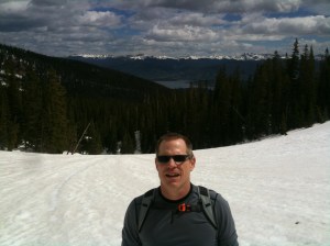 The approach to the pass between Peak 5 and Peak 6 is deceiving. You keep thinking you’re there but there’s always a little more to go uphill. You do become concerned about avalanches by the time you’re almost under the cornice of Peak 5. This picture captures your wonder as you stare at the cliff wall. Although to be fair, the more likely cause of your gaping mouth is that you’re sucking wind at 12,000 feet. Tumbleweed snaps the photo of you with Lake Dillon in the background.