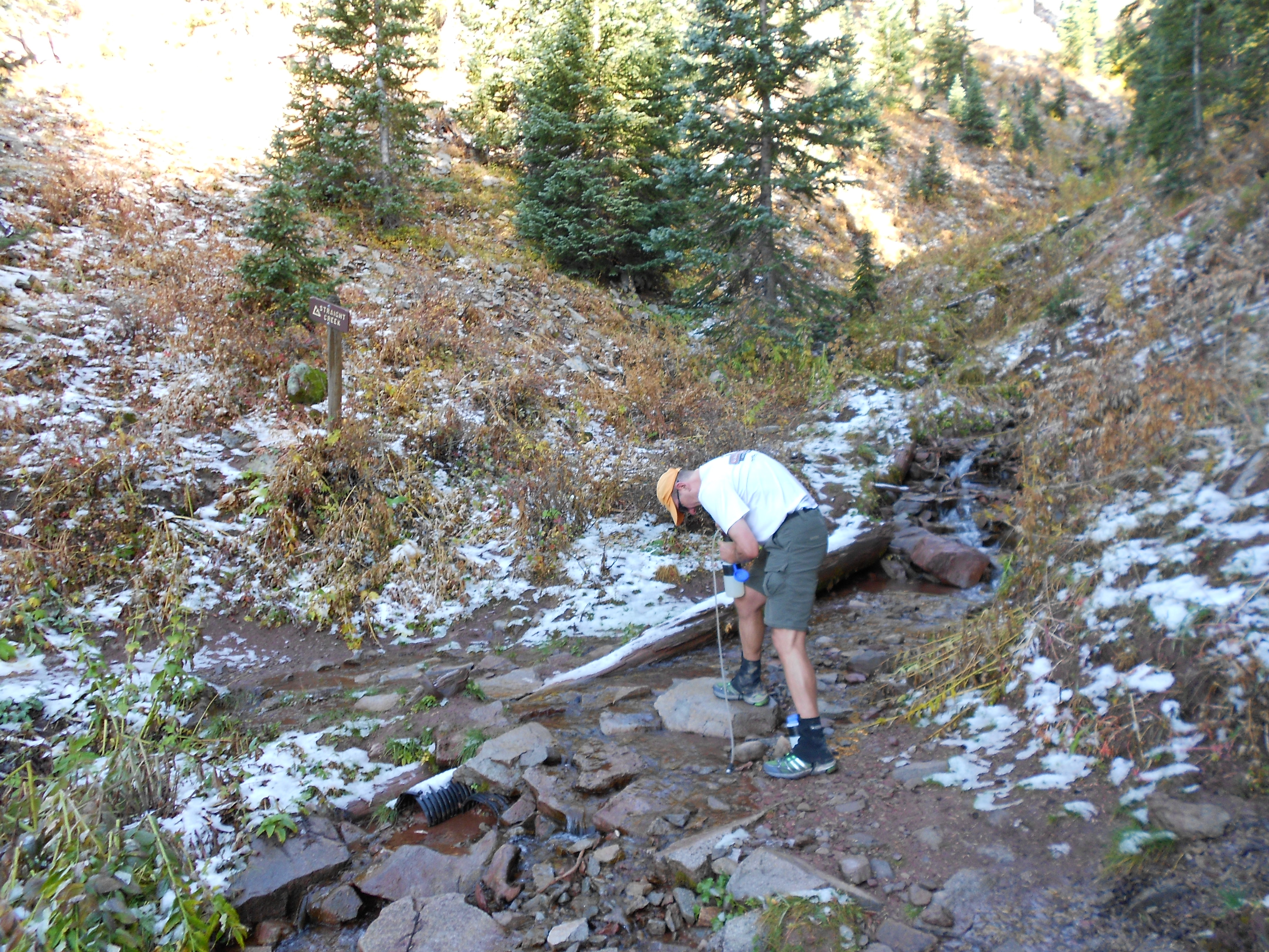Somewhere in the middle of this you cross Straight Creek where Tumbleweed filters more water. Much of the trail is covered in icy rain and you’re careful with your foot falls when walking down steep slopes. You pound your feet harder than normal into the ground as you walk to make certain you gain traction on crushed ice.