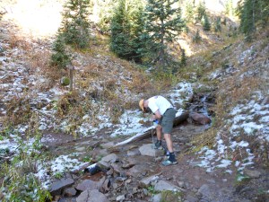 Today’s hike has been entirely in the trees ever since dropping down from Kennebuc Pass. Much of the San Juans has been on ridges at or above treeline. The first 7 miles is also completely downhill, not too steep, but gradual and constant following Junction Creek. You cross this creek several times, the final time at 7.1 miles over a wooden bridge. You rest here before beginning the next section which is your final climb – 1000 feet over 4 miles.