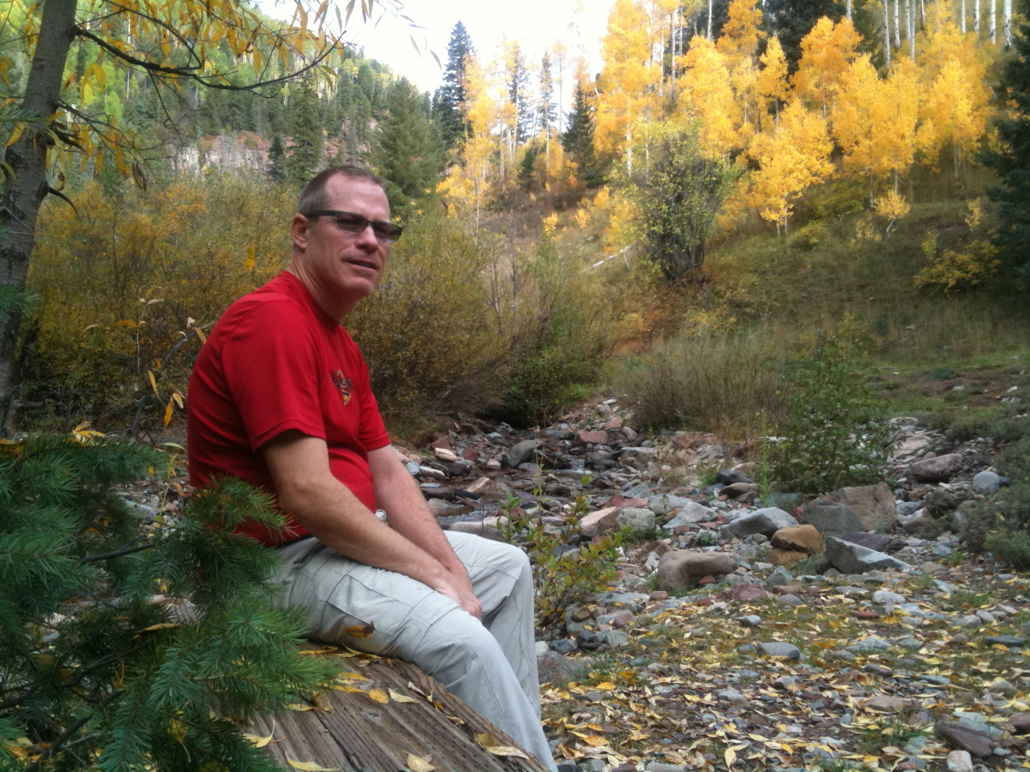 Brittany no longer works at Snarfs so you pick up a sandwich for lunch in the car and two more for lunch tomorrow at Jimmy Johns. Not as good but good enough. Highway 285 is gorgeous. The parking lots on both sides of the highway at Kenosha Pass are full – presumably from camera toting hikers. Monarch Pass along Hwy 50 is even more colorful. Half the cars driving in front of you at some point stop for the passengers to get out and take pictures of the fall colors. Turning south on Hwy 550 you see the snow covered San Juans which are the first thing to compete visually with the gold leaf aspens. Beyond Ouray, on the Million Dollar Highway to Silverton, you nearly stop yourself to take a few snapshots. Never in your life have you seen such spectacular scenery. You reach Molas Pass after 6.5 hours of driving and Tumbleweed has pizza and beer waiting. Not that he waited – he’s nearly full.