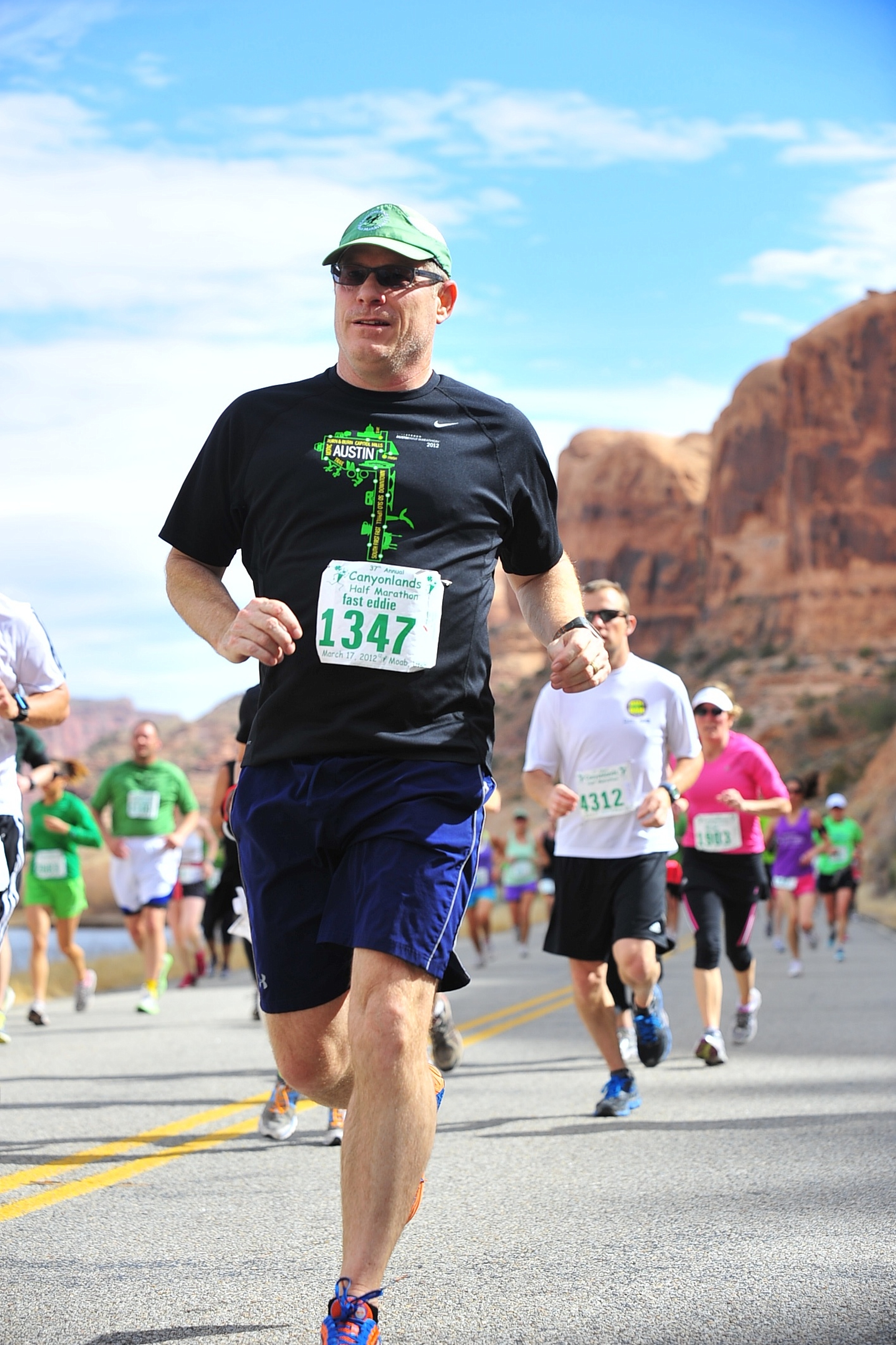 I’m disappointed that I slowed down to 9:13 on the 12th mile. I had planned to run hard from the top of the 9 mile hill to the finish. I did do well in mile 11 but the wind on mile 12 was a real bear. And it was up hill again. Many people think this course is essentially a downhill run. The elevation map makes it appear that way, but actually for every 4 feet of elevation loss there are 3 feet of gain. It’s a hilly run. At altitude. Something about the canyon though just sucks you in and makes you want to run this course fast. Running into mile 10 is one of the coolest parts of this course. As I see the canyon walls narrow up ahead I can’t help but think, “Indian ambush”. Before I know it I start to hear drums. I suspect maybe I’m hallucinating and tell myself to drink water at the next aid station. The drums beat louder as I close in on the end of the canyon – nearing the junction where Hwy 128 will turn left onto Hwy 191. That will start the uphill headwind toward the finish and I do expect that to be a battle. Suddenly I turn a bend and come face-to-face with the green drummers. Sort of sounds like they could be playing an Irish tune in honor of St. Patties Day.
