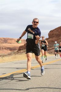 Rob and Kelly sped through the Canyonlands with really good times. This is Rob likely shouting “mahalo” to the cameraman and Kelly is in the red and white shirt in the first pic at the top of this post. They didn’t seem to notice the hills and wind. I’ll point out that neither of them beat my time from last year of 1:47, but I’ll admit the wind was considerably stronger and more persistent this year. I’d like to know their splits on mile 12 when running into the head wind from hell. There was a guy earlier in the race, maybe as early as mile 6, but somewhere in the second half that an aid was trying to pull off the course because he looked ready to topple over. Safe to say he didn’t make it past mile 12. Perhaps if I’d started out 20 seconds or so slower per mile I might have been able to keep up with Rob longer. Or Kelly if I would have found him before the run began. I didn’t exactly push myself to run hard in this event, but might have run a bit faster if I had someone to pace with closer to my speed. I suspect if Keith and I had run together we would have run about a minute faster and felt none-the-worse afterward. I didn’t even put on a kick. I rarely do nowadays. My final mile was in 8:50, again in line with my 8 splits in the 8:50 range. That’s Keith in the pic below in a dark t-shirt with Steve – who also ran the same pace as us.
