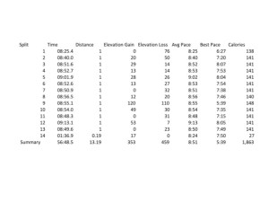 But I don’t know Keith’s splits. Mine are in this graphic, and you can read them well enough if you click on the picture to enlarge it. I started off too fast with an 8:25 pace the first mile and 8:40 the second. This was fine for Rob as he left me after two miles and apparently sped up as he finished with an 8:22 overall pace. Once I slowed down, I felt great. I was more interested in running comfortably than speedy, and that’s what I did. I’m somewhat impressed really at how consistent my splits are. Eight of my 13 miles are in the 8:50s, and of course my overall average was 8:51. I even ran the 9th mile, which as you can see from the elevation stats (or elevation profile map) has the big hill, in 8:55.