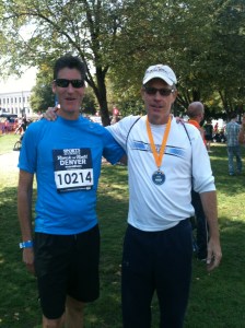 This picture is of Keith and me after the run on Saturday. I was able to talk to him more about the run today via email. Keith mentioned two big factors. One was the pavement. That didn’t occur to me but both of us mostly run on trails and are not used to asphalt. Keith noticed and it might be why my knees are still sore. There’s no asphalt for old men. I don’t intend to try adapting to roads though. The Boulder Marathon will be on some gravel roads and I’m hoping it’ll be lower impact.