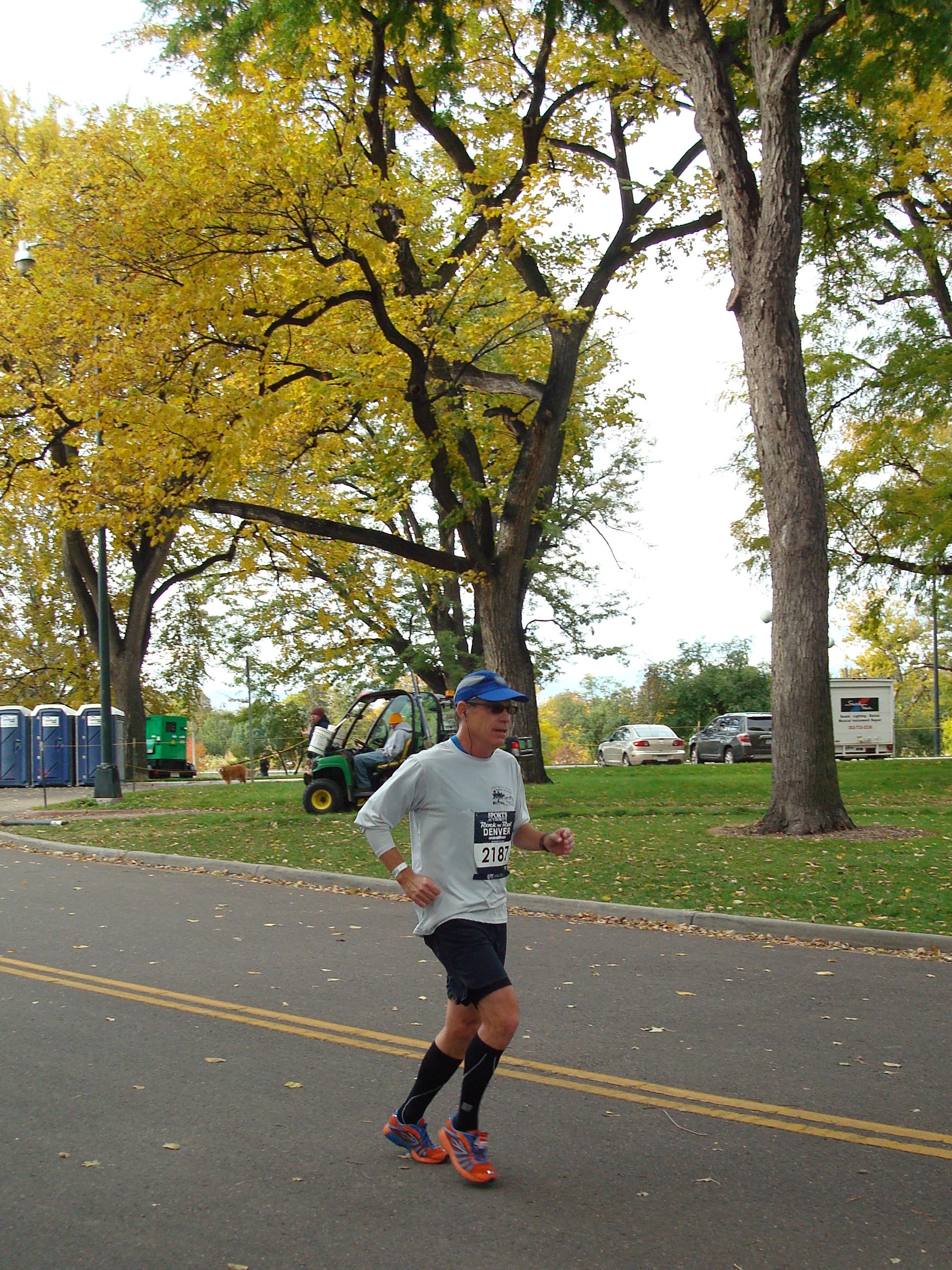 I’m happy with my form in this pic – taken in Washington Park at 17 miles into the Denver Marathon. Good to see my toes are pointed down. I recall fatigue setting in around this point and beginning to focus on form. That’s what I did today. I focused on form, on keeping my toes pointed down and arms at a good angle moving forward. I didn’t start breathing hard until I started racing Katie with a sub 7 minute mile. I’m glad I got outside today. I’ll be ensconced on the couch for the remainder of the day watching college football. I love November.