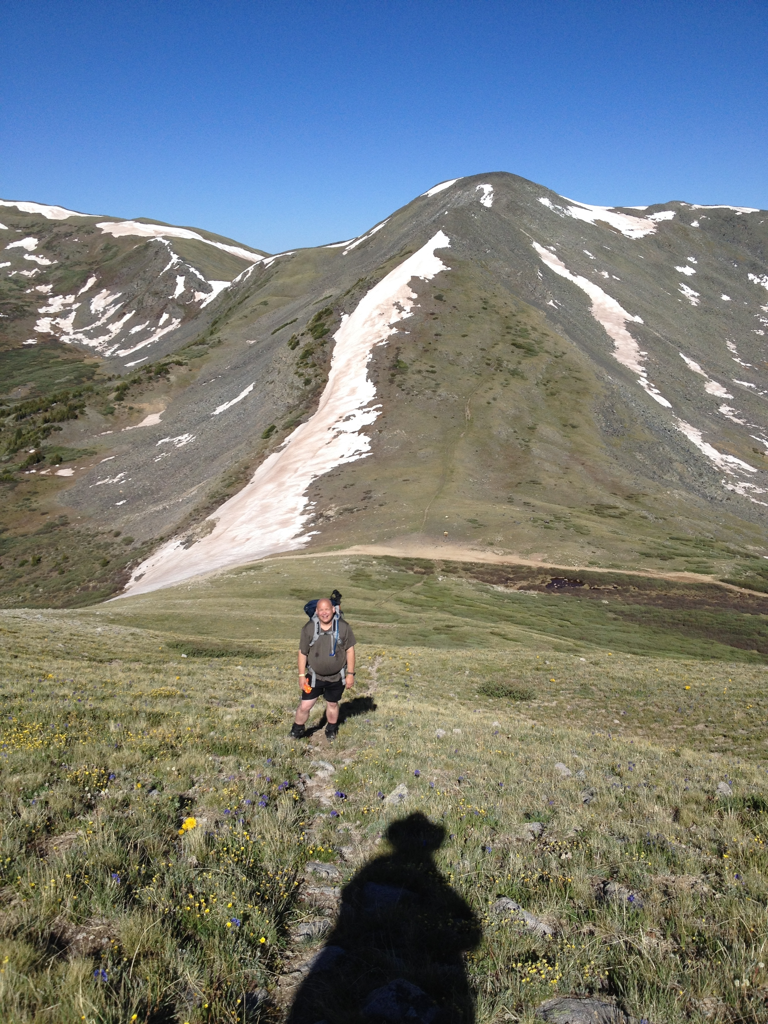 Mike leads us to the top and the views are impressive.  This is the Continental Divide and we can see both sides.  Crested Butte fifty miles to the west.  Aspen’s Maroon Belles to the north.  God’s country everywhere.  At over 12,000 feet, possibly heaven.  The descent is tough on the quads and knees but quick.  I leverage my trekking poles for stability.  We reach Mirror Lake in another hour and this completes our shortest day to date.  We head back over Cottonwood Pass Road for lunch at K’s Burger joint in BV.  We run some errands and actually I forget what all we did for the afternoon.