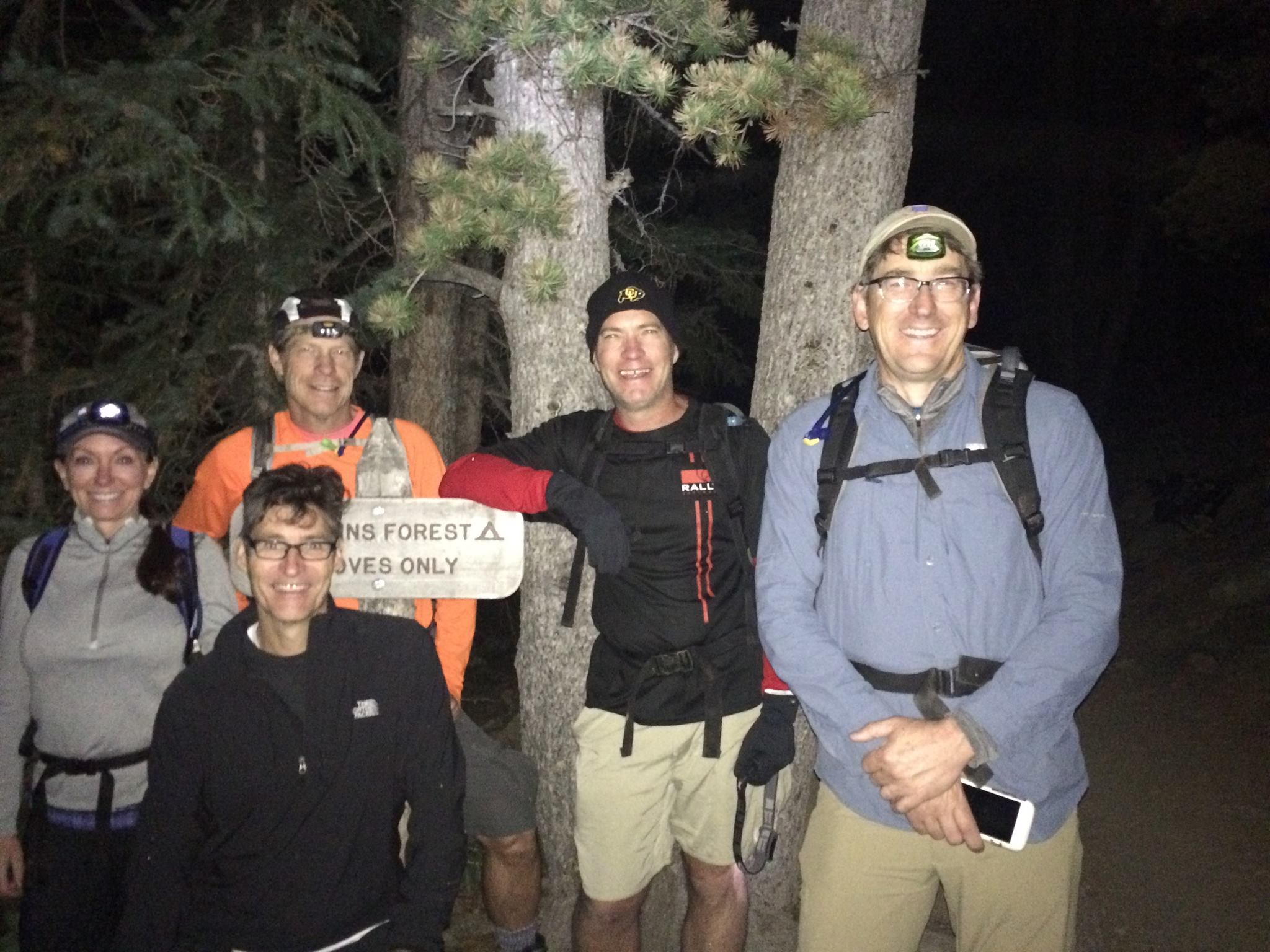 We initially planned for a 3am start. There are several reasons for this. As one of the most difficult class 3 14ers in the country, Longs Peak is crowded with most hikers hitting the trailhead between 1am and 3am. It’s a long, slow hike, mostly above treeline, and the early start is needed to avoid the typical afternoon thunderstorms. Steve’s buddies had some experience hiking Longs Peak and recommended we wake up at 1:30. We did and hit the trail by 2:30am. As you can see in this photo, we’re all wearing headlamps.