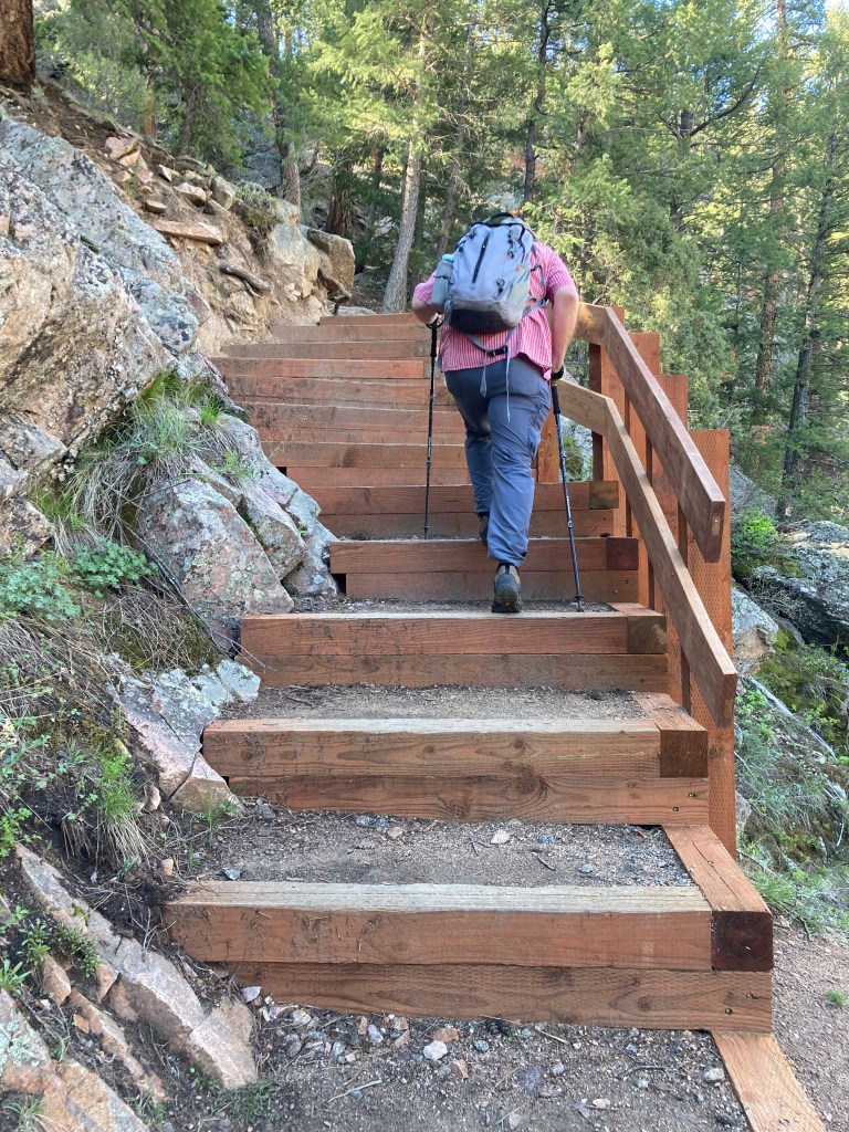 I met a guy, Rob Decker, at the Jagger’s post-vax, house party last night. We were talking publishing and he mentioned he spent over a million dollars advertising on Facebook last year. Because he makes art posters out of national park photos that he shoots, styled after the 30s and 40s Works Progress Administration efforts, we eventually began a discussion on hiking. Rob told me to hike this loop clockwise, because these steps induce most of the mountain bikers to ride counter-clockwise. This photo only shows a fraction of the steps. Trust me, this is the original stairway to heaven.
