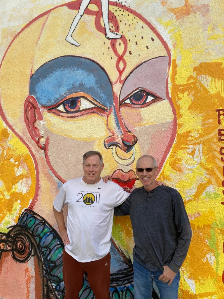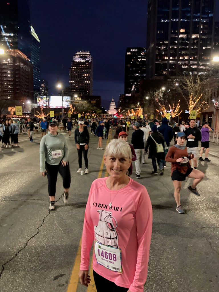 After a day and a half partying in downtown Austin, Nan and I found our way to the starting line Sunday morning. I gifted her the tech t-shirt the Christmas before last. A tip for other self-published authors; never overlook the opportunity of leveraging your siblings as billboards.