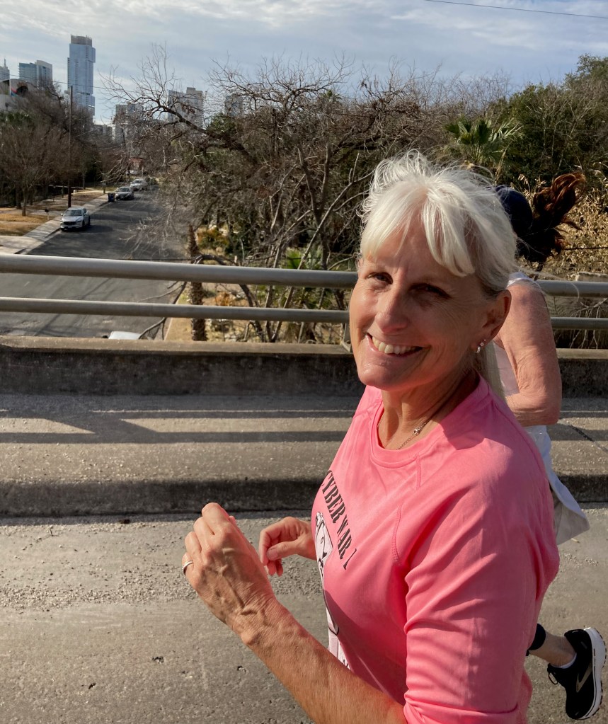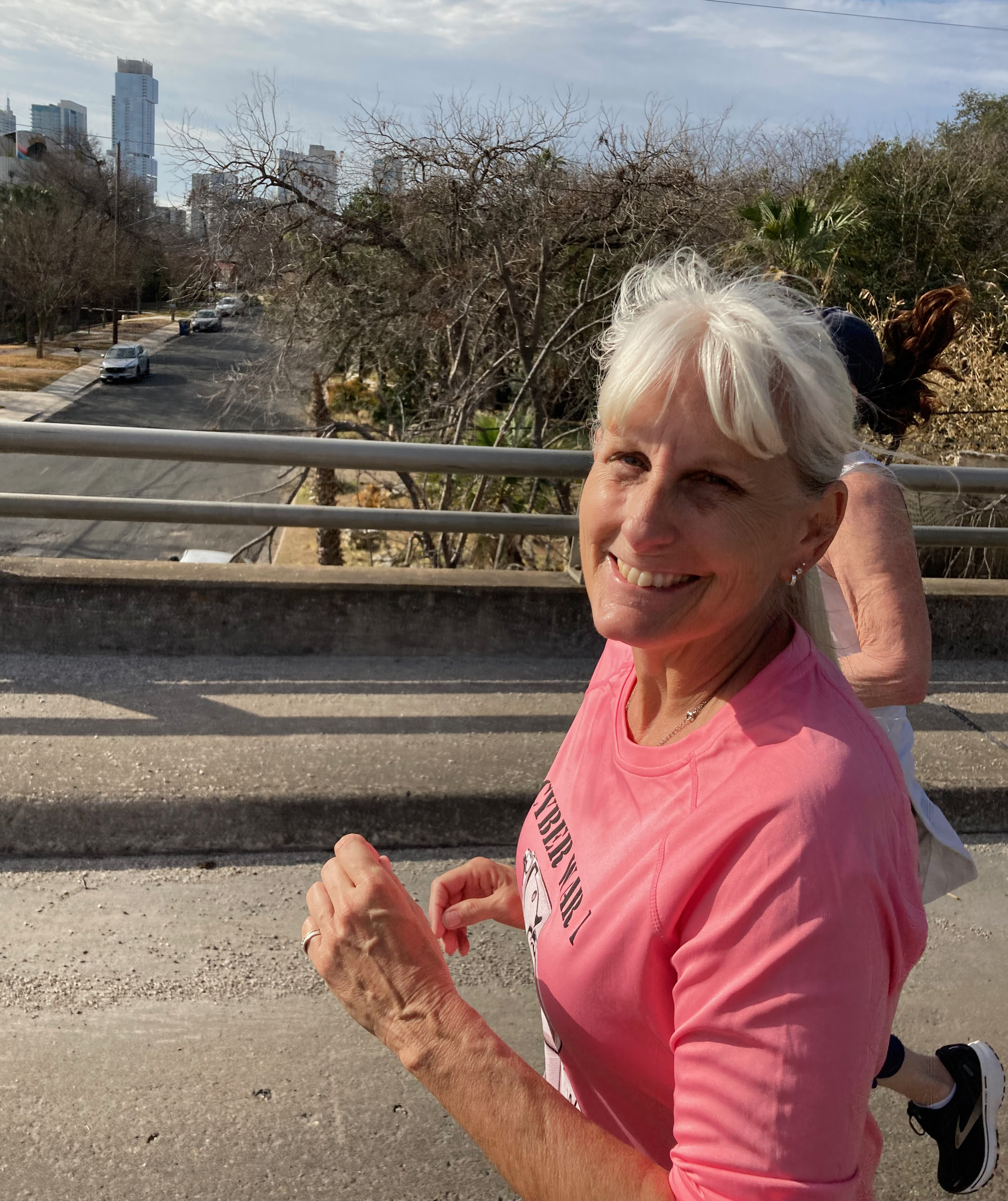 Nan was still smiling at mile 12 as she crossed the bridge over Lamar. Youth.