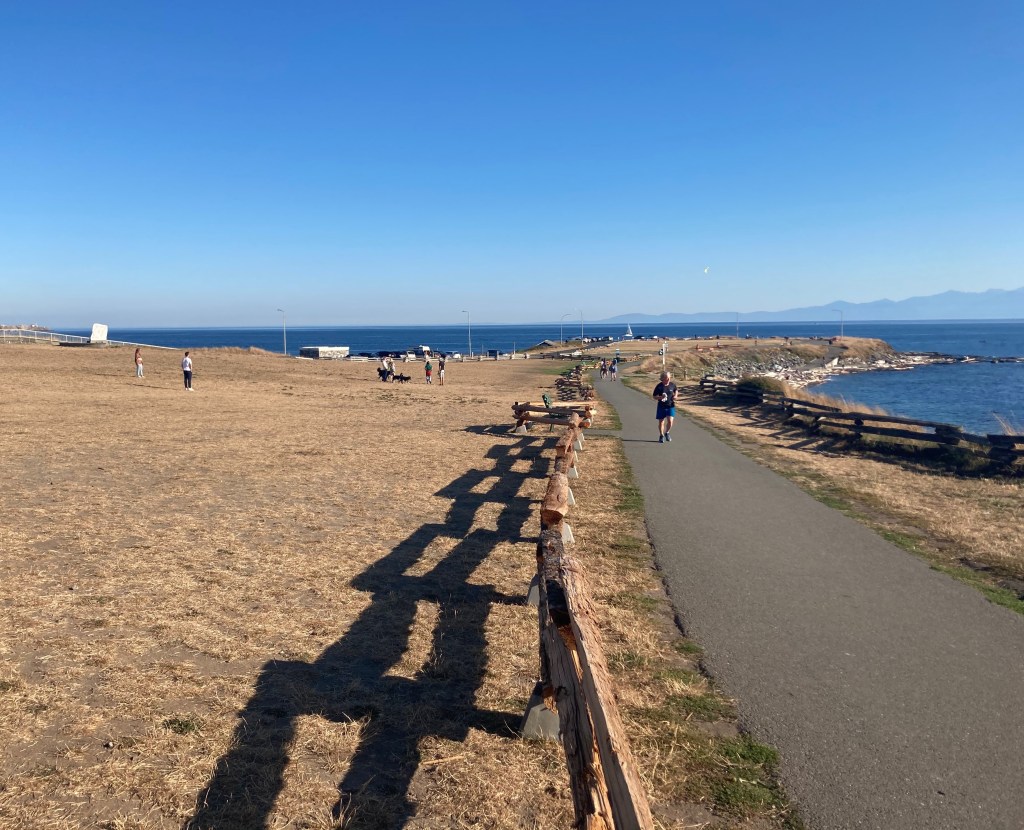 The Dallas Road Waterfront trail is asphalt, not as bad as cement, and it is an urban trail after all. What I found more amazing than the view was the dog park that ran alongside it for a good mile.