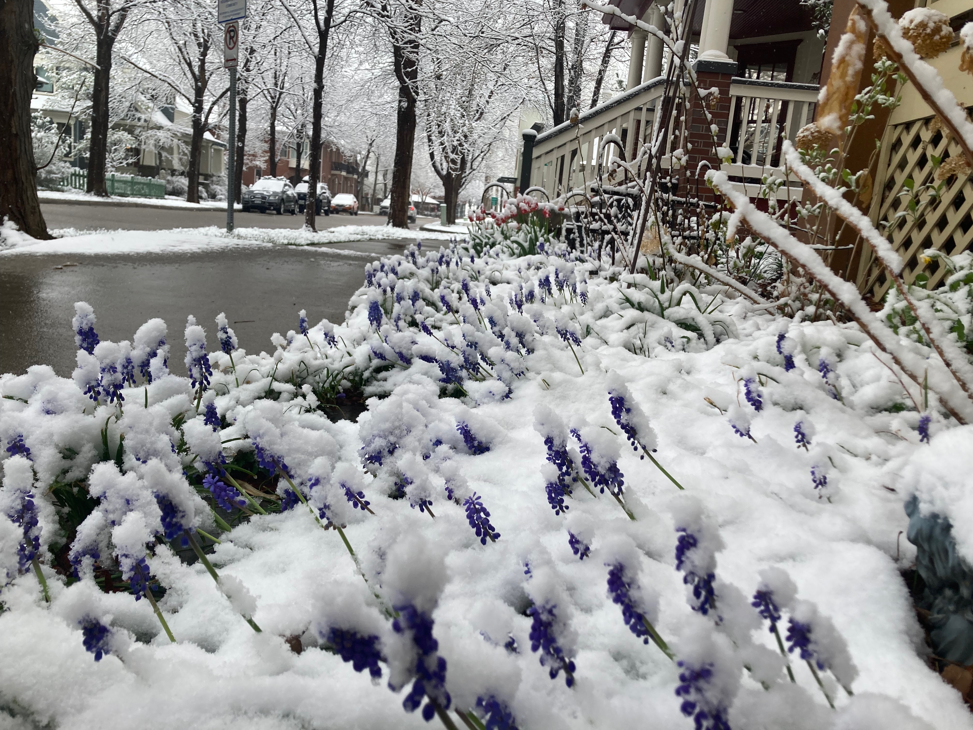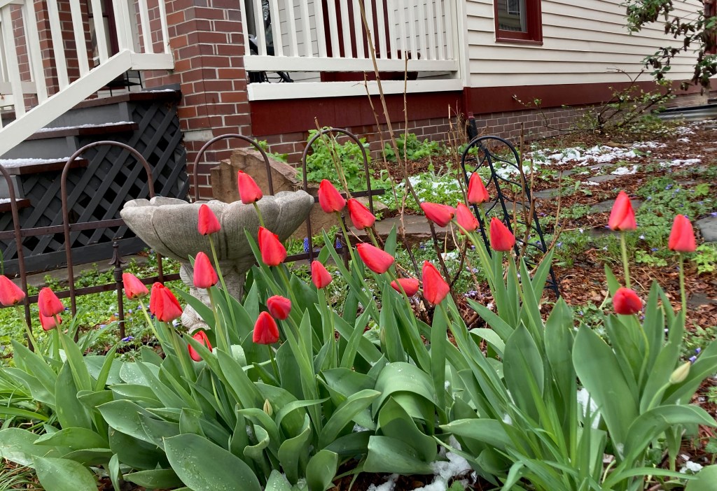 As I launched off the porch for today’s 12-miler, the tulips were bathed in snow.