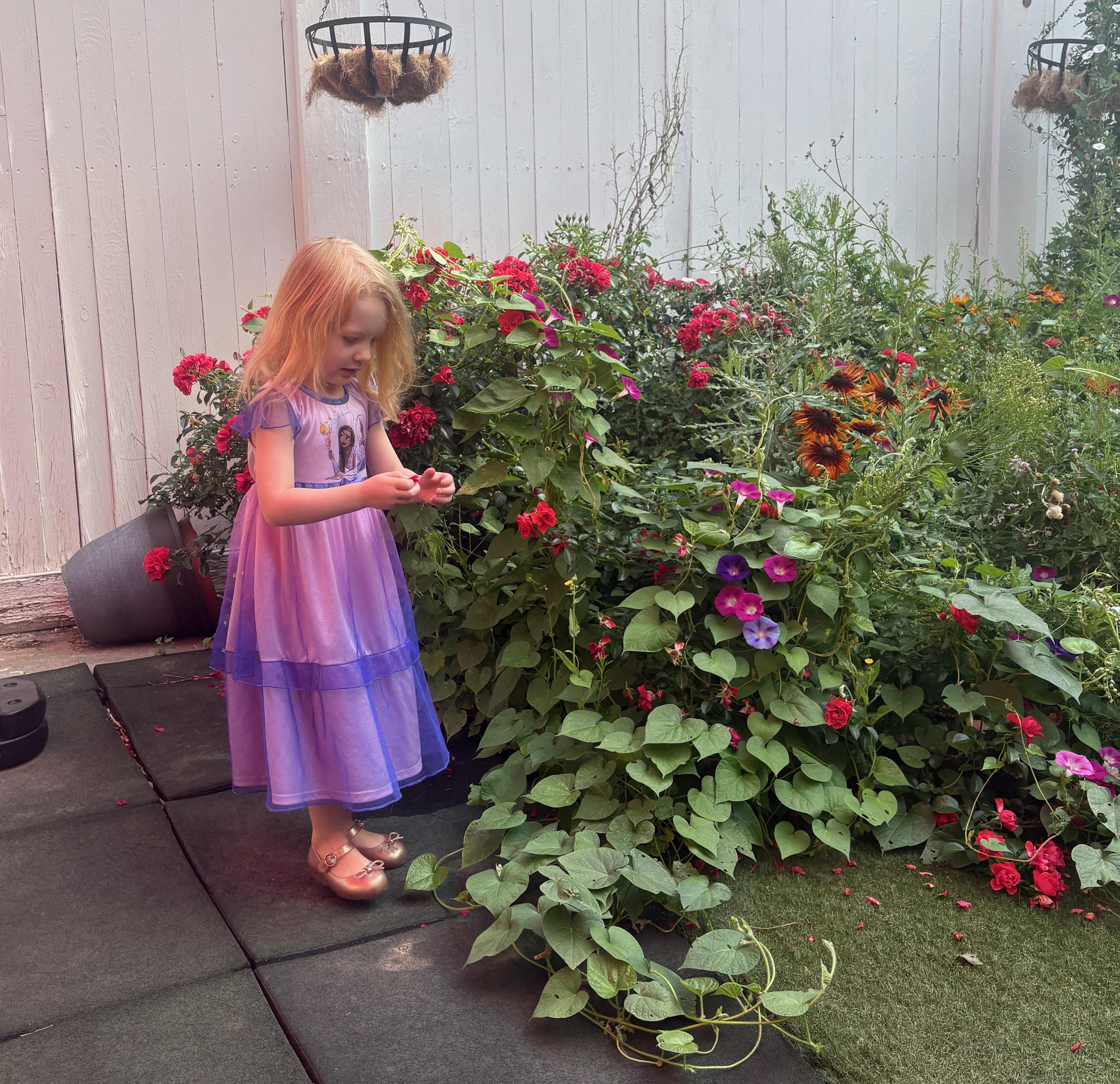 She found bees trying to build a new nest in her playhouse and instructed me to migrate them to the flowers, which I did.