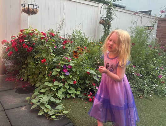 Margot woke up at 7am Saturday, and after a healthy breakfast of yogurt and lil smokies, she announced she was going outside to play.