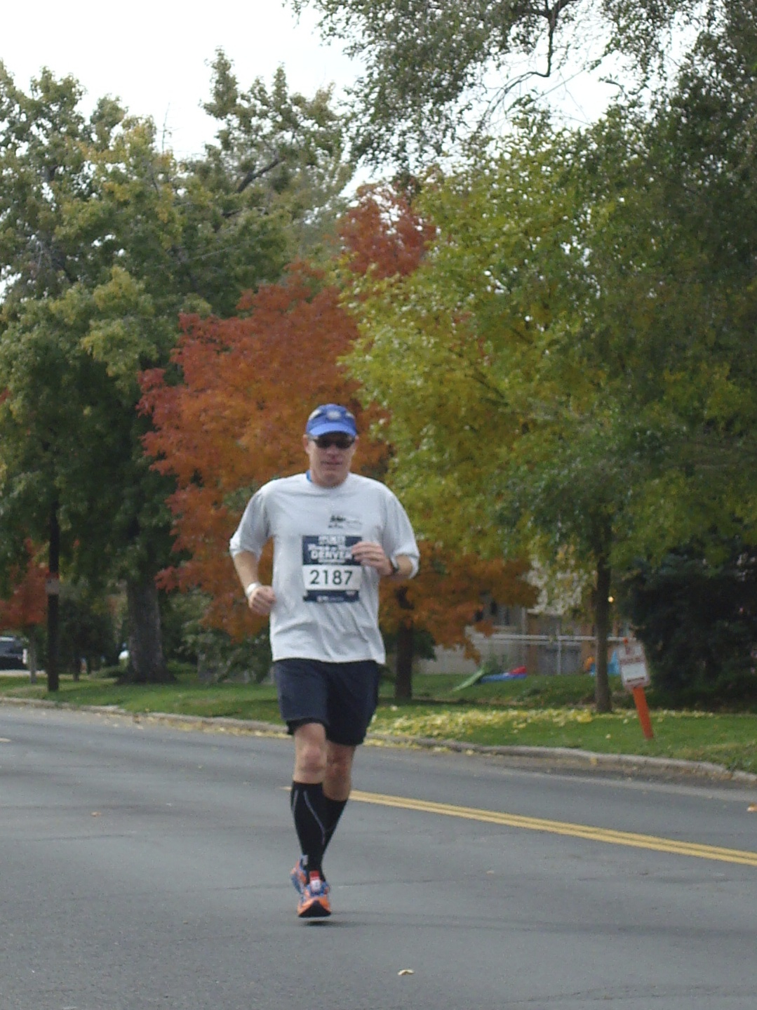 When I saw the weather last night on my weather channel app, I made the call to pin my bib to a short sleeve shirt. I went with the hi tech T that came from registration. Sort of a wimpy baby blue to be honest, but my eyes are blue so it couldn’t help but look good. I need more blue shirts. I paired this with black North Face running shorts that have good pockets and a nice overall feel. No gloves. No hat. Just sunscreen, my ID, $20, candy and an iPod in my pockets. I listened to a playlist from mile 6 to mile 13 but grew weary of it. I did wear some fleece warmups waiting for the start but stored those in my gear bag with my iPhone. The weather was awesome. Starting at 7 in Downtown Denver means the sun is too low to clear the buildings and most trees in the parks until half way through the run. And even then, the air kept some coolness in it.