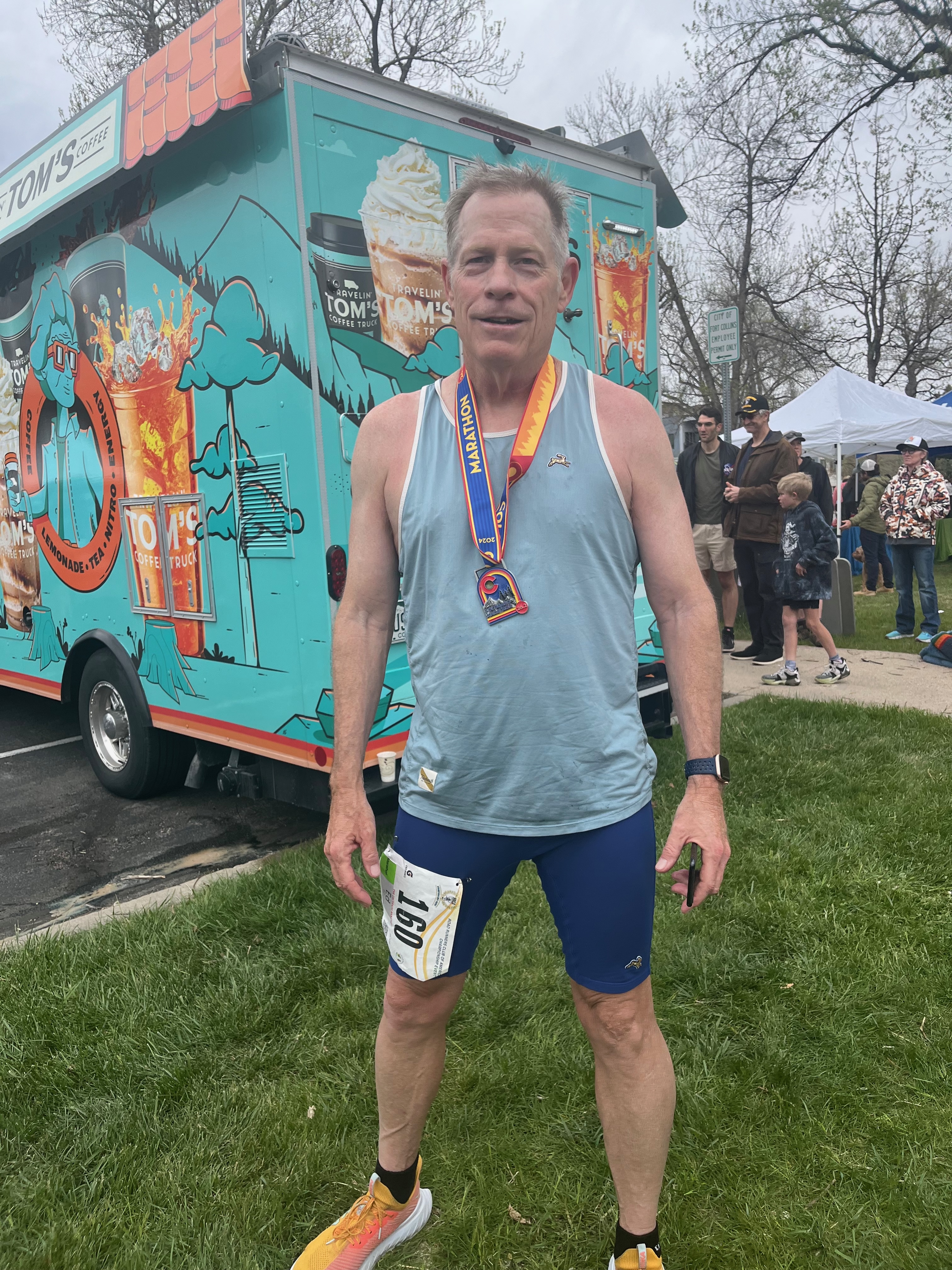 Ten minutes later I tried standing and found I couldn’t. My calves began cramping whenever I tried to stand. Then they began cramping just sitting there. Soon, both lower legs were cramping non-stop. I don’t know what the thin muscle is called that runs along the top of the shin, but it would cramp as soon my calf would recover. These two muscles alternated cramping non-stop. And this was occurring in both legs at the same time. Not sure I’ve experienced this level of pain in decades. And I was hardly quiet about it. A couple of medics soon came over with a wheel chair. They were simply volunteers and didn’t really know how to help me, let alone get me in a chair. Then a paramedic arrived who was also a collegiate sports trainer. He massaged my legs hard – quite literally crushing my muscles. This worked. He was also able to help me to my feet. I had to go to the medical tent where they made me drink a 20 ounce Gatorade spiked with salt. This was like drinking from the Gulf of Mexico but I drank it down. I walked out before they formally released me because you can’t drink beer in the medical tent and from where I was standing I could see the beer tent. This was a slow, awkward shuffle, but I was able to manage.