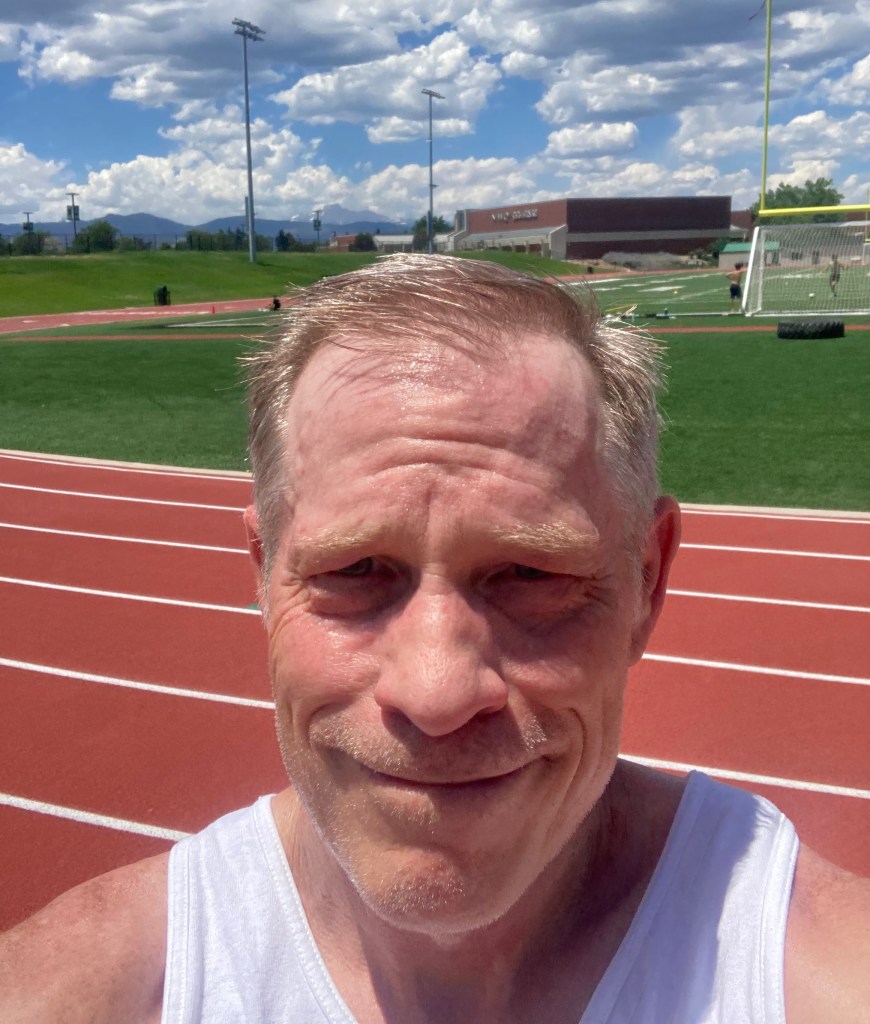 This is me today, running on the track. I intend to run 400 meter intervals for the month of August to improve my cadence and stride length before the Boulder Marathon at the end of September. I ran 4x400s today and I’ll add one more interval each Sunday until I reach 8, which is what I used to run in college, 8x400s.