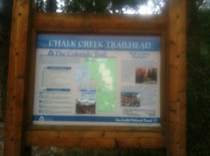 Typical of launching from a creek bed, the trail begins with a steep incline, affording you a nice view to your left of the chalk cliffs. The Chalk Creek TH is somewhat low in elevation for the Sawatch range at 8400 feet. This segment of the CT remains fairly low only reaching a height of 10,200 feet, but rides up and down like a roller coaster. This is hard on your legs but you take advantage of the flat segments to run much more than you expected.