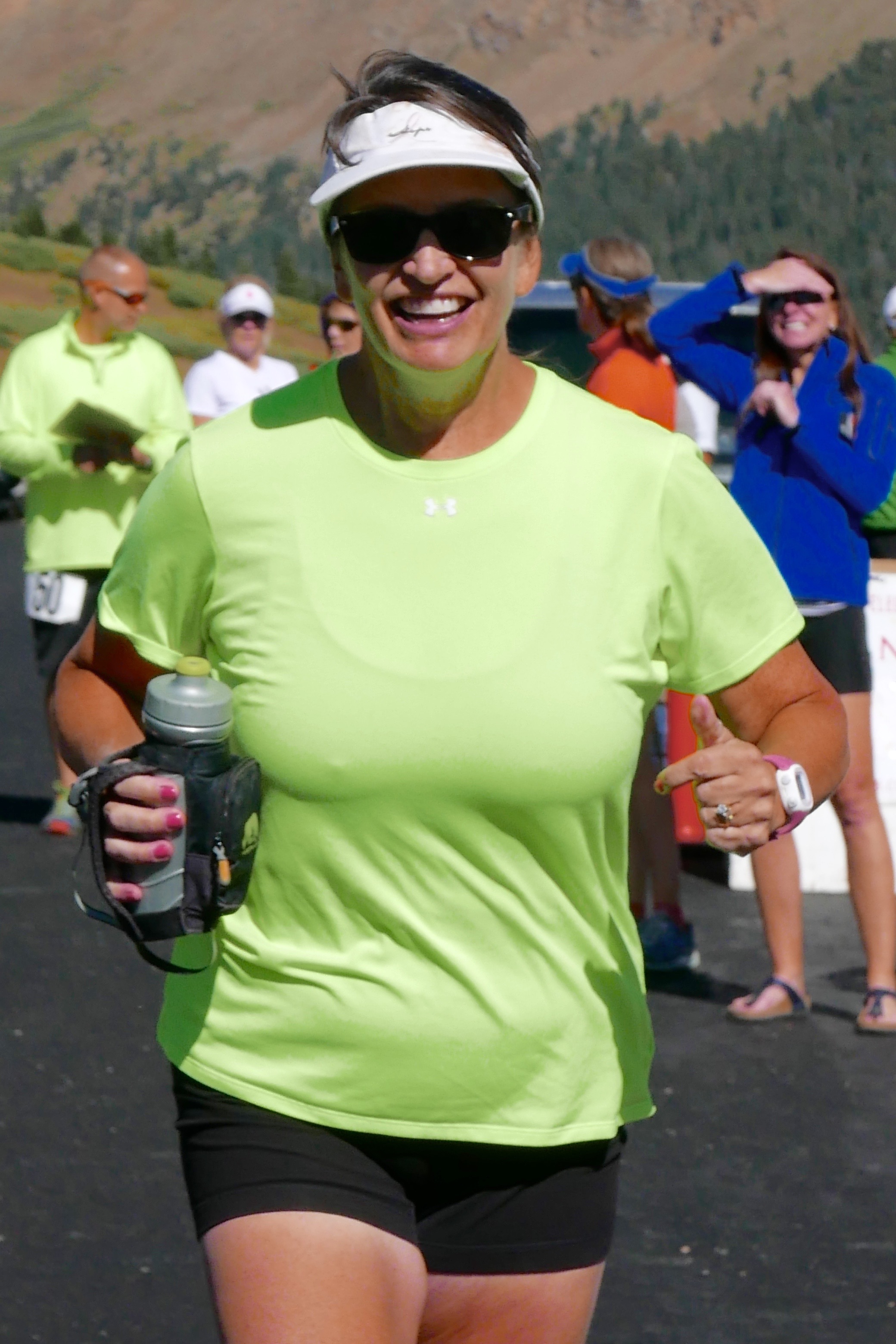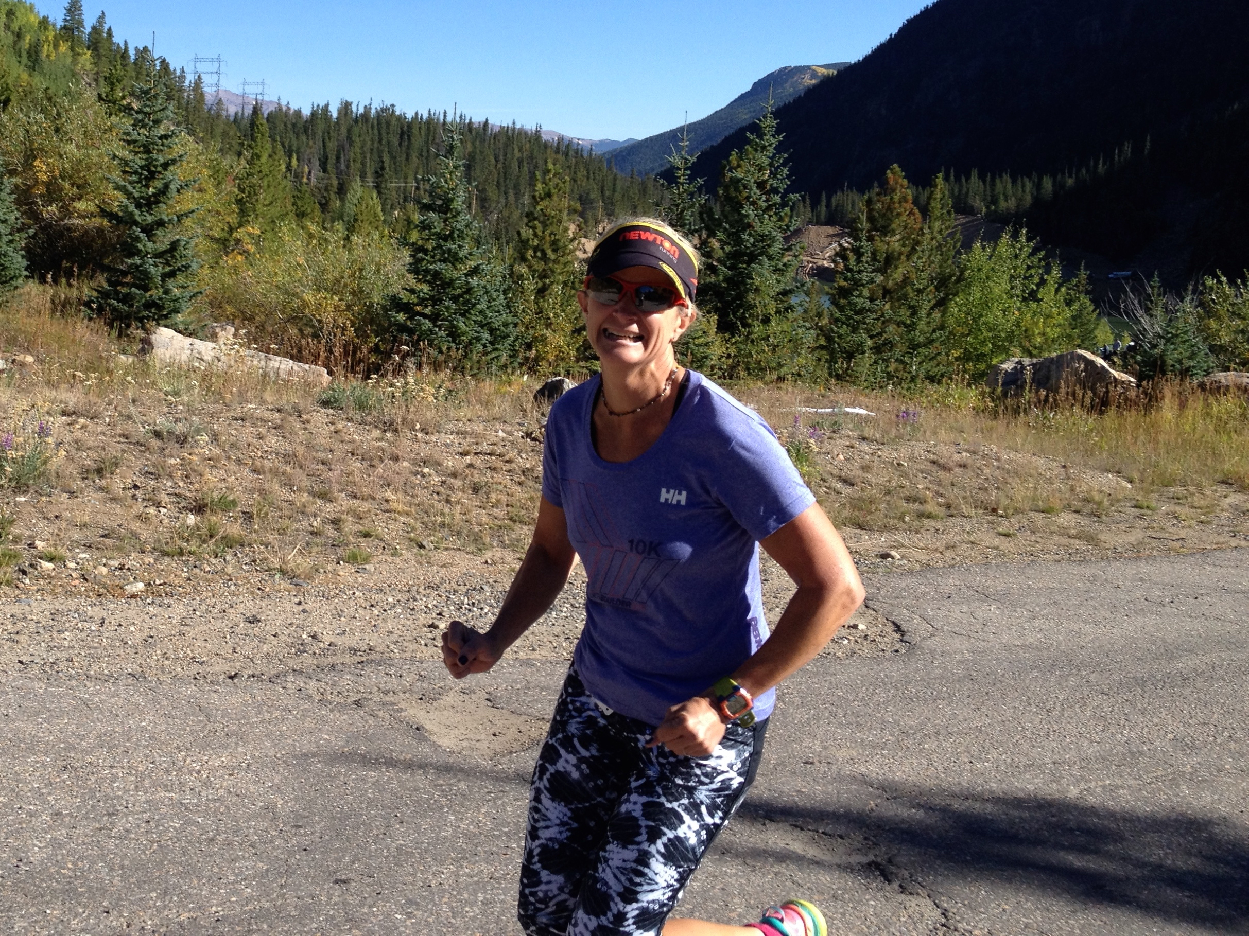 I hand off to Jen. Because our team is short a 10th runner, Jen runs two back-to-back legs, 7.1 miles into Georgetown. Jen was part of my Longs Peak climb two weekends earlier. She hasn’t been running much this summer. She’s a busy working mother of two, running her State Farm insurance agency in Longmont. After recent trips to Europe and Minneapolis, she’s back home and ready to run. She does regular bootcamp workouts that leave her core strong, and she’s simply a natural runner. She has no problem with this high-altitude, uphill run into Georgetown.