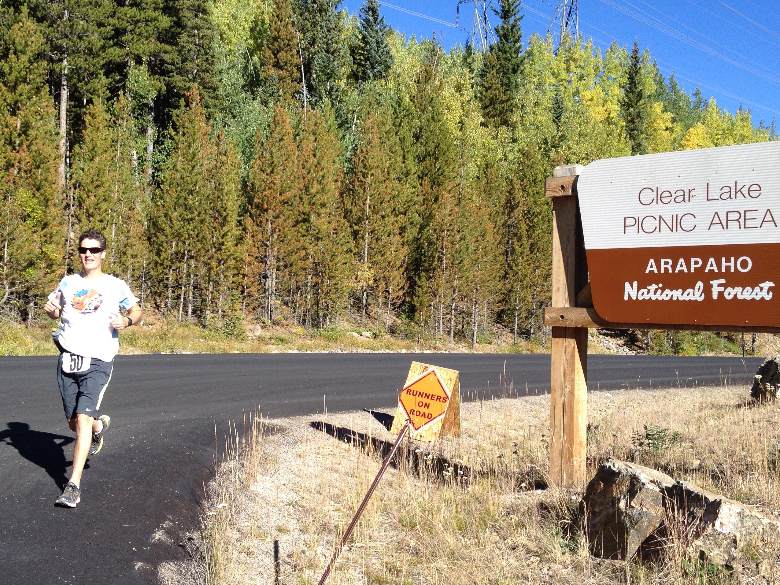 My kickoff leg starts at 6:30am from a parking lot in downtown Idaho Springs. I have to wear a safety vest and lights as the sun has yet to fully rise. Only three other runners launch with me in my starting wave. It’s a fast start, likely due to excitement but I suspect also to stay warm. The September mountain air is crisp and ideal for running. I regret my fast start almost immediately as we climb a steep single track trail to a bike path that leaves me gasping for oxygen the rest of the 4.5 mile run. Our route follows I-70 toward Georgetown with long, rolling hills. My intent is to run an easy warmup pace but somehow I average 7 minute miles. I credit the cold air and initial race-start buzz. My plan was for a warmup and to save my legs for my second leg, but this strong run gives me confidence.