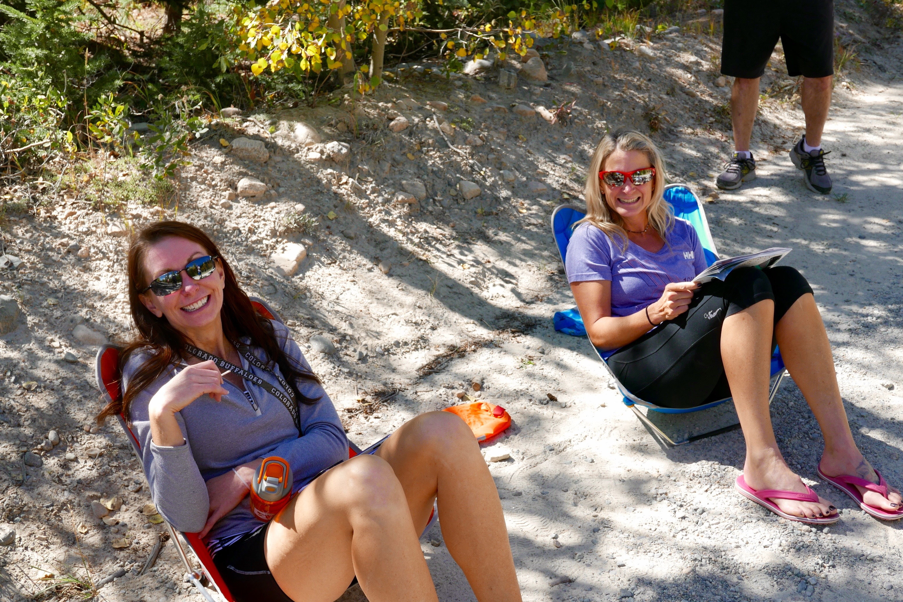 Jen and Kristin, sitting together here at the Jefferson Creek Trailhead, meet for the first time on this relay and become instant friends. Our entire team, both vans, are able to meet at this exchange to wait for Steve to finish and me to start. They tease me later because I’m as antsy as a schoolboy waiting to begin the run over Georgia Pass.