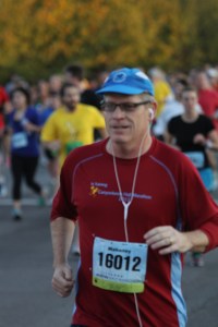 The weather felt fairly pleasant at first and I was starting to feel like I might have over dressed and felt remiss for not bringing a short-sleeve shirt. I could have taken multiple shirts with me inside my gear bag, but I’d committed to my white Under Armour, long-sleeve compression jersey. I wore a red long-sleeve fleece top over that, along with gray fleece pants – both Under Armour as well. But my plan was to store those in my gear bag before running. Then the wind picked up noticeably and the clouds began to form overhead. I actually pulled my wind jacket out of my gear bag at that point to stay warm. We had another 60 minutes before the start of the race and we all began to re-assess our wardrobe selections. I did however start to feel more confident that I was good with long-sleeves.