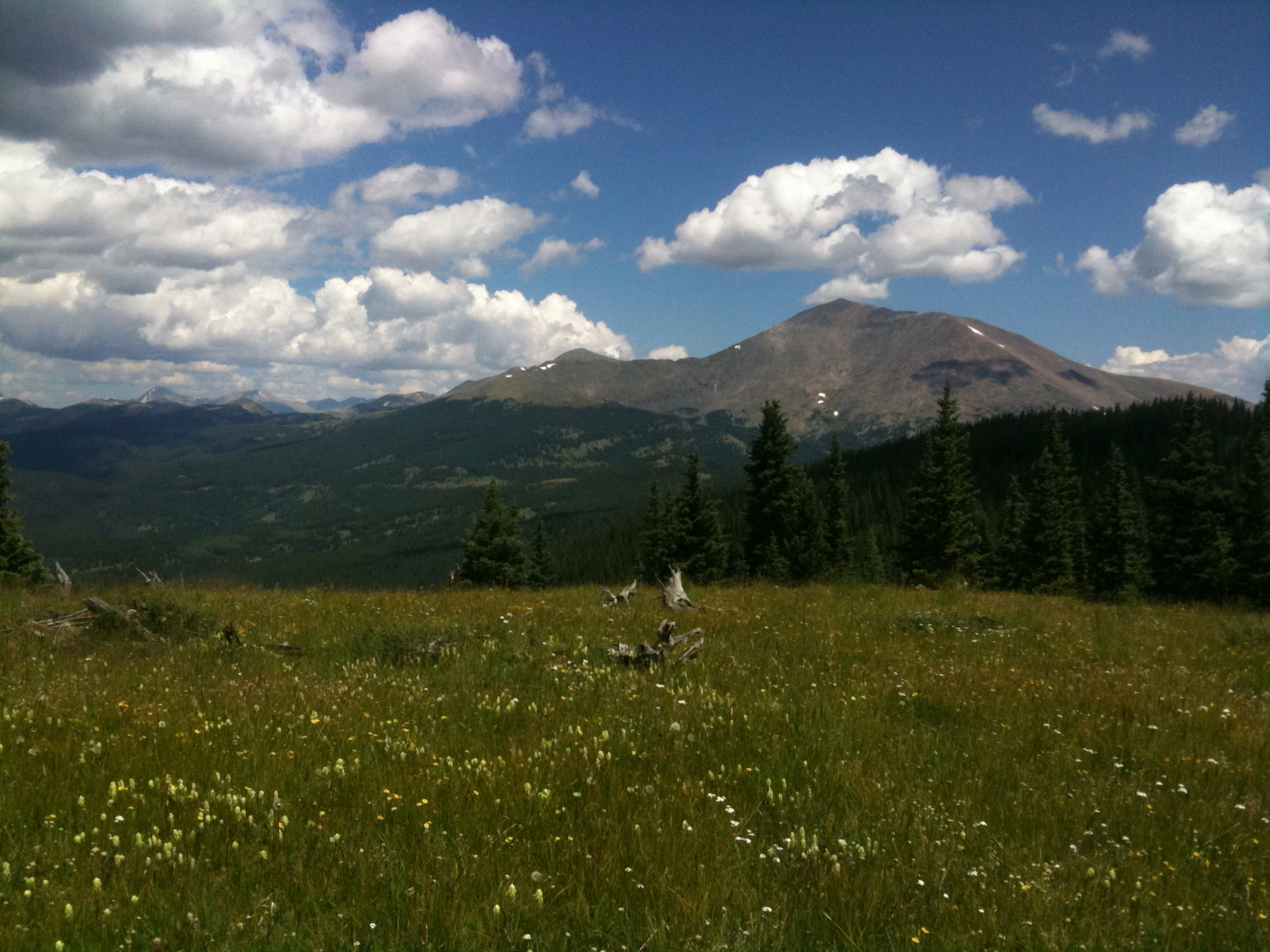 The climb up provides some decent views of the Collegiates to the north. You run some dips but mostly maintain your hiking pace. It’s a nice day but rain is expected and you can see the clouds begin to form. You don’t expect to be vulnerable though and even look forward to a light rain.