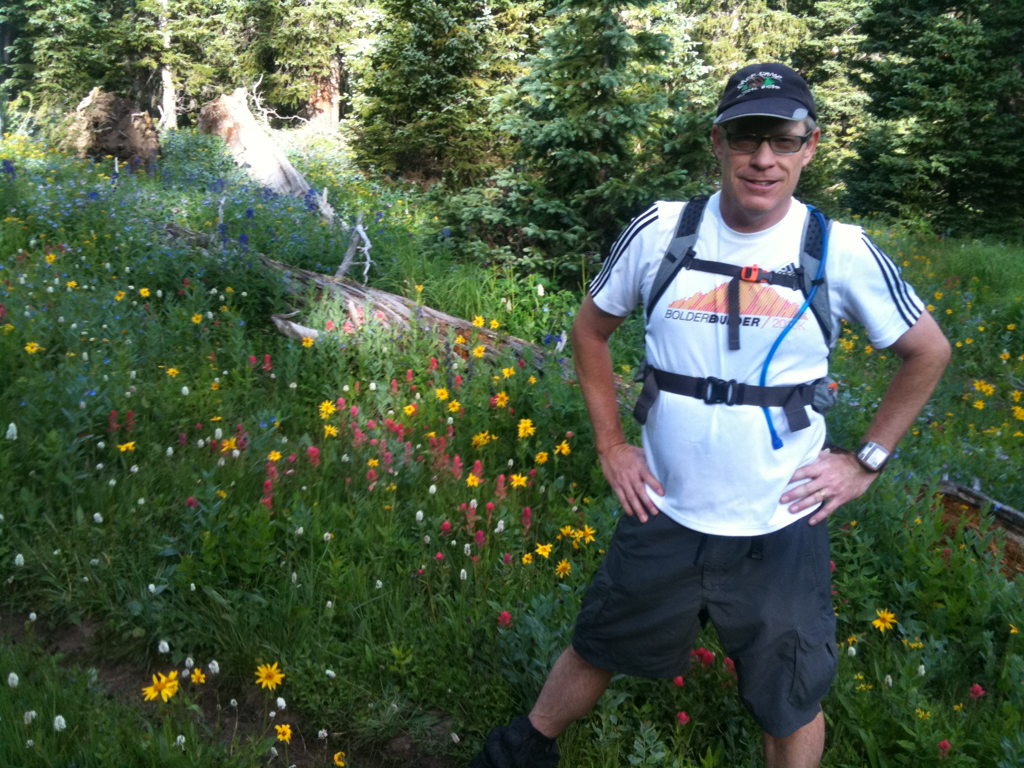 The trail is nice with some patches of good dirt and pine needles. It’s an uphill climb for the first 7 miles so you don’t run, but you do maintain a decent 3 mile per hour pace. The elevation tops out just under 12K and you find you’re now well conditioned to hike strong even uphill at this altitude. You barely rise above treeline, but you do cross through some beautiful mountain meadows littered with wildflowers. You’ve been waiting for such meadows; this is the time of year to get up in the mountains.