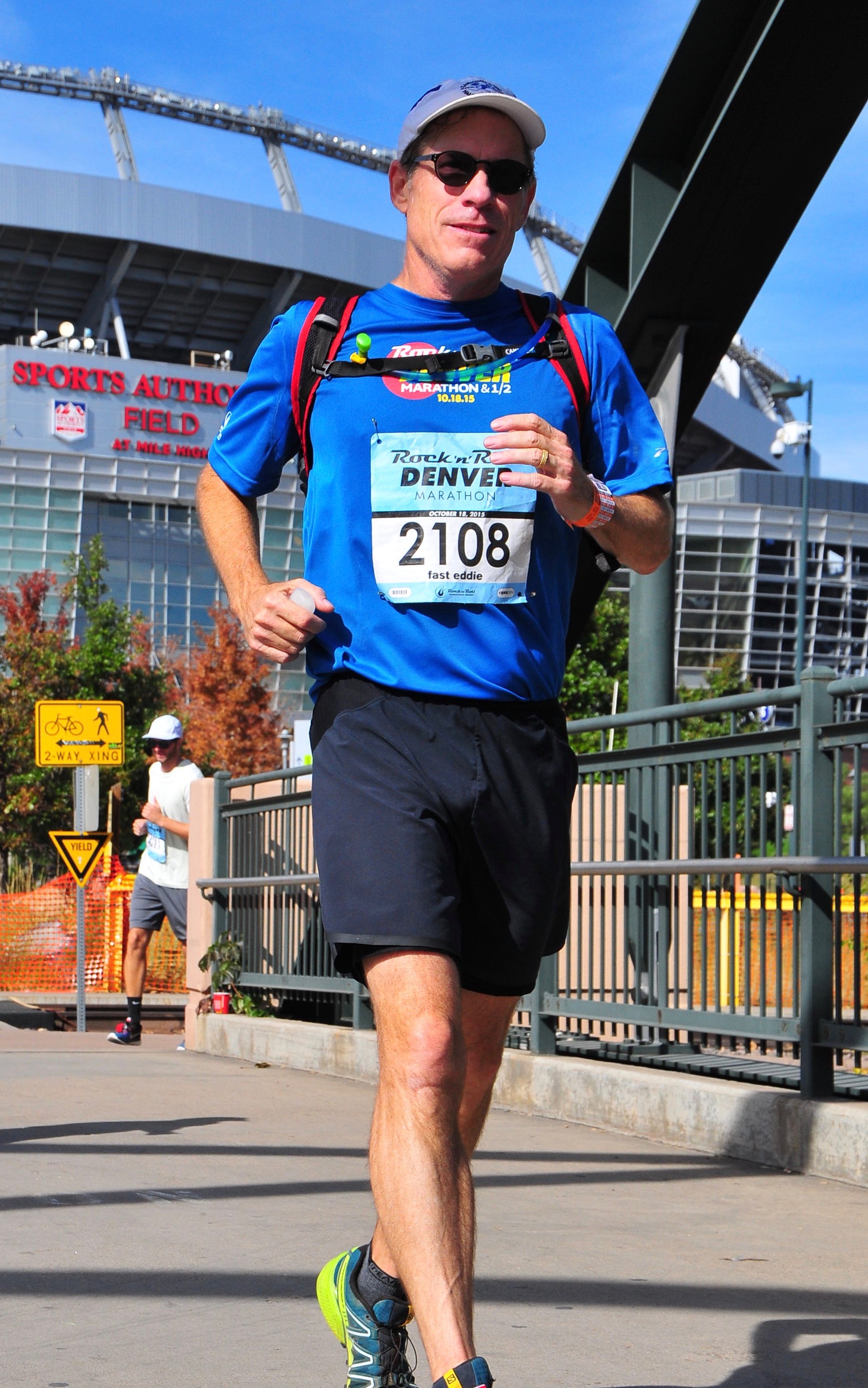 This year’s course has some key changes. We still run down 14th Street, past the Pepsi Center. Instead of crossing Speer, we turn west on it and run up and around Sloan Lake. The lake neighborhood is pretty once we reach it. This is a much hillier course. This doesn’t bother me since it’s early in the run. I pace with Chris the first two miles as he starts out with controlled 9 minute miles before accelerating to a 7:30 pace. My Garmin records 8:58 the first mile, and 8:32 for mile two. This is the last I see of Chris for awhile as he quickly surges away on an uphill segment. The road conditions are a bit disappointing with significant construction debris. I later meet a woman who fell and was injured from this.